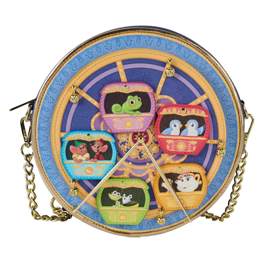 Up and down and 'round we go! Take your wardrobe for a whimsical whirl with this charming crossbody bag. Set the scene in motion by humming your favorite tune while spinning each of these beloved Disney sidekicks on their swinging carriages! This bag makes a playful addition to any outfit and brings a bit of theme park magic to any day.